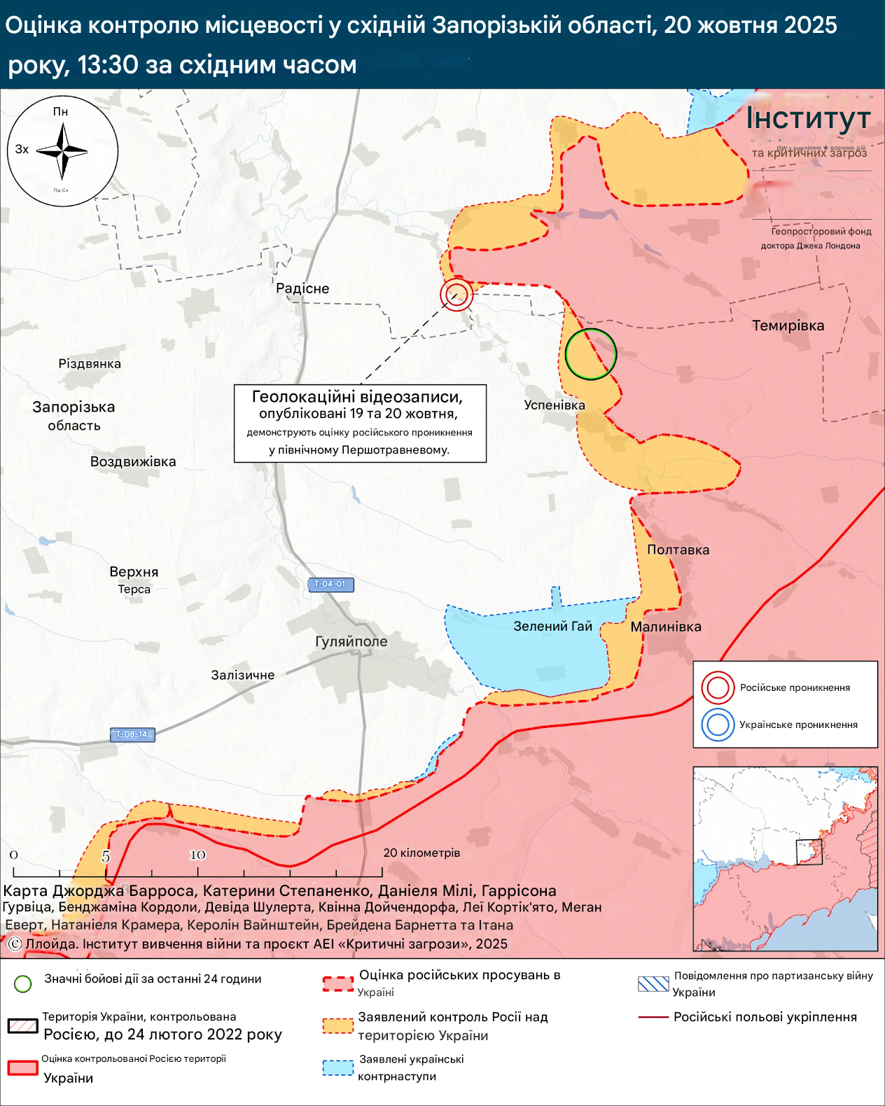 На геолокаційних відеозаписах, опублікованих 19 та 20 жовтня, видно російського військовослужбовця, який піднімає прапор у північній частині Першотравневого, ймовірно, в рамках російської місії з інфільтрації малими групами. ISW оцінює, що ця подія не змінила контроль над місцевістю або переднім краєм зони бойових дій (FEBA).