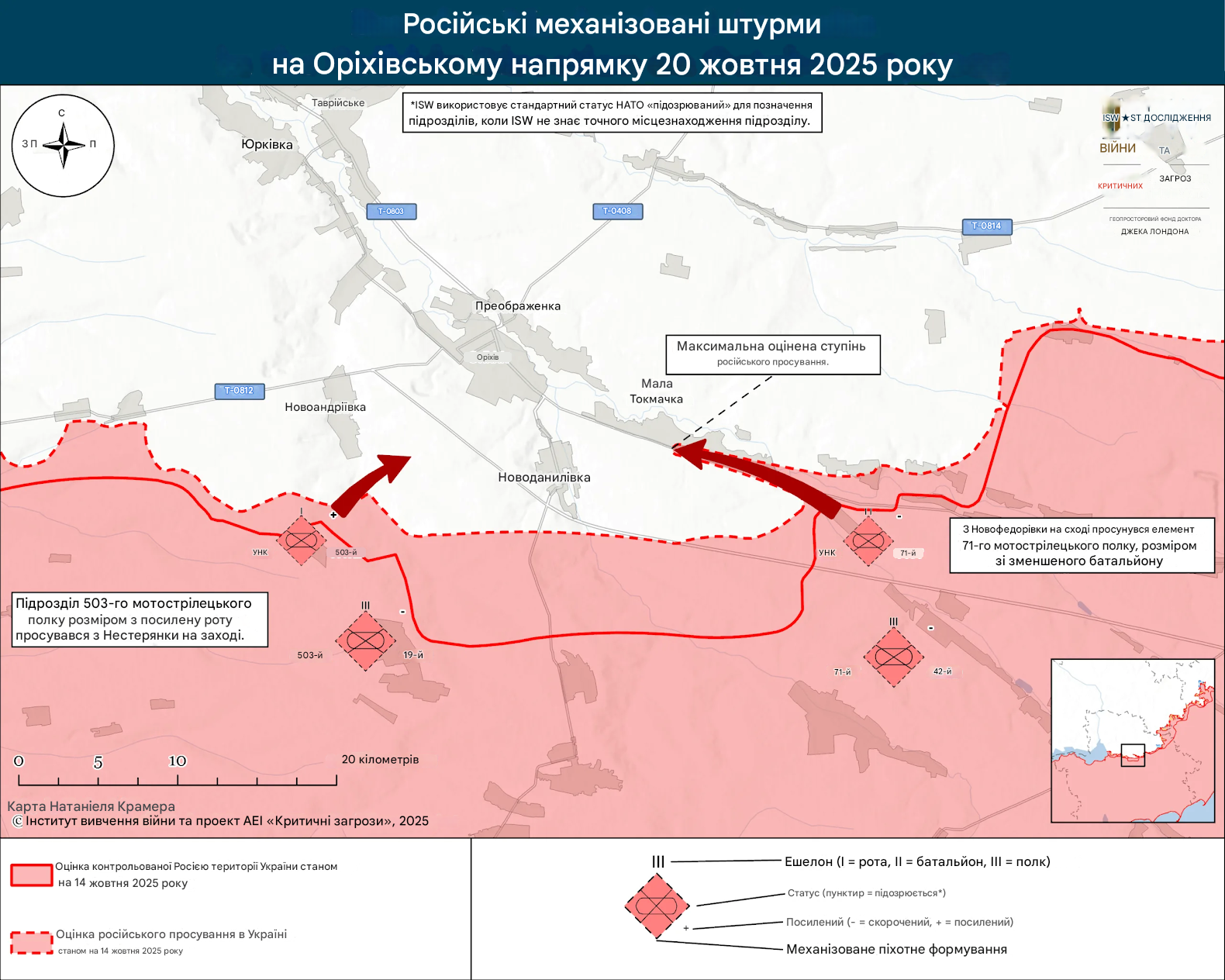Геолокаційні відеозаписи, опубліковані 20 та 21 жовтня, свідчать про те, що російські війська нещодавно просунулися в центральній частині Малої Токмачки (на південний схід від Оріхова) під час нещодавнього механізованого штурму, що скоротився до батальйону. Українські джерела приписують підрозділам російського 71-го мотострілецького полку (42-га мотострілецька дивізія, 58-й ЗВА, Південний військовий округ [ПВО]) проведення однієї хвилі механізованого штурму поблизу Малої Токмачки, а підрозділам 503-го мотострілецького полку (19-та мотострілецька дивізія, 58-й ЗВА) проведення іншої хвилі поблизу Новоандріївки (на захід від Оріхова). Російський мілблогер також приписує підрозділам 70-го мотострілецького полку (42-га мотострілецька дивізія) участь у хвилі штурму поблизу Малої Токмачки. Українська бригада, що діяла поблизу Малої Токмачки, повідомила, що російські війська здійснили механізований штурм о 14:00 за місцевим часом 20 жовтня, і що російські війська атакували з Вербового (на південний схід від Малої Токмачки) та Новопрокопівки (на південь від Малої Токмачки), використовуючи приблизно 26 танків та іншу бронетехніку. Бригада повідомила, що російські війська атакували кількома хвилями по п’ять-вісім машин протягом кількох годин, і що українські війська пошкодили 22 одиниці бронетехніки. Південні війська оборони України повідомили, що інша українська бригада, що діяла поблизу Новоандріївки, відбила посилений російський механізований штурм розміром з роту, знищивши або пошкодивши всі 12 танків та бронетехніки, що брали участь у атаці, а також вісім із дванадцяти мотоциклів. Російський мілблогер 21 жовтня заявив, що російські війська скористалися поганими погодними умовами, які ускладнили операції українських безпілотників, для проведення механізованих штурмів, що відповідає поточній оцінці ISW. Метеорадар Ventusky зафіксував опади поблизу Оріхова вранці та вдень 20 жовтня.