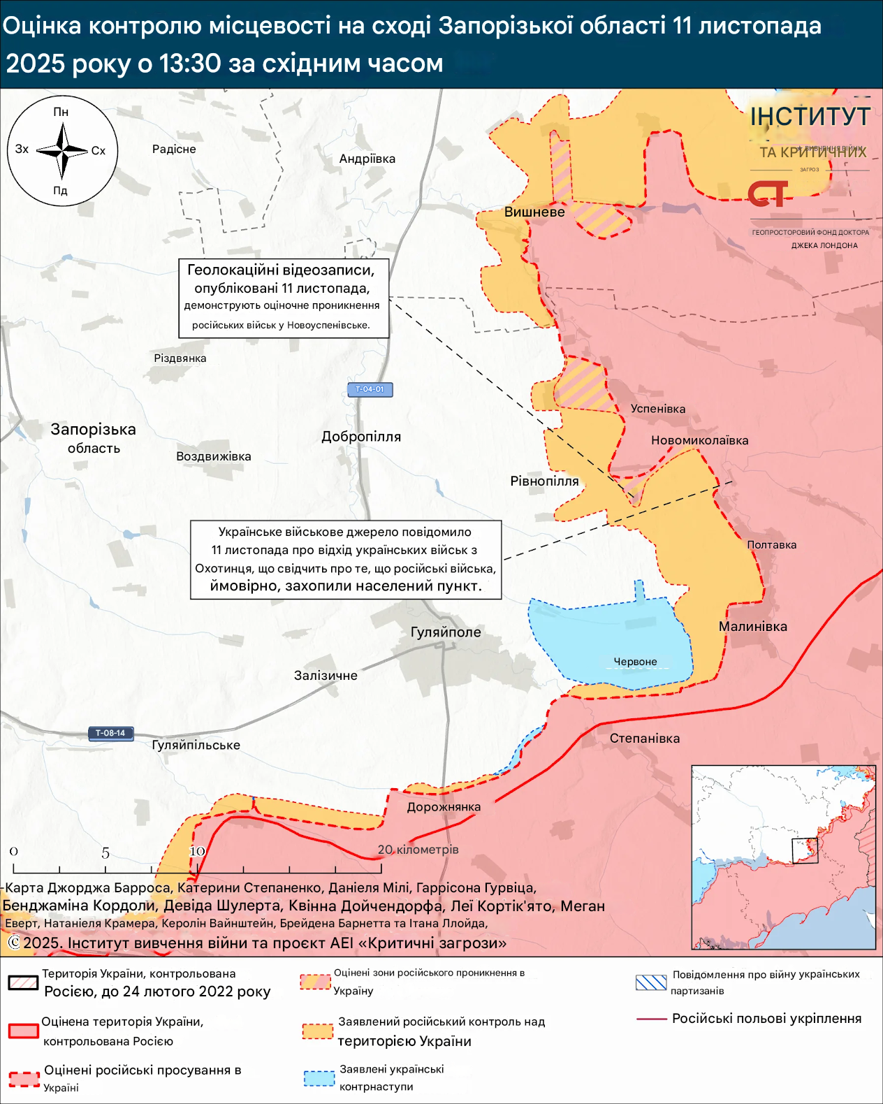 Геолокаційні відеозаписи, опубліковані 11 листопада, свідчать про те, що російські війська нещодавно захопили Охотниче (на північний схід від Гуляйполя). Речник Південних сил оборони України полковник Владислав Волошин 11 листопада повідомив, що українські війська відступили з Успенівки та Новомиколаївки, а також з позицій поблизу Охотничого, Новоуспенівського та Нове (усі на північний схід від Гуляйполя). Геолокаційні відеозаписи, опубліковані 11 листопада, показують двох російських військовослужбовців, які піднімають прапори в Новоуспенівському, що, за оцінкою ISW, було місією з інфільтрації, яка на цей час не змінила контролю над місцевістю або переднім краєм зони бойових дій (ПДБ). Джерело, яке, як повідомляється, пов’язане з українською військовою розвідкою, заявило 10 листопада, що спірна «сіра зона» в районі Солодке-Новомиколаївка-Рівнопілля (на північний схід від Гуляйполя) останнім часом значно зросла. Російські джерела, включаючи Міністерство оборони Росії, стверджували, що російські війська захопили Новоуспенівське. Російські мілблогери стверджували, що російські війська захопили Солодке та просунулися на захід від Злагоди, до східних околиць Яблукового (все на північ від Гуляйполя), на захід від Новоуспенівського та на схід від Веселого (на схід від Гуляйполя). Волошин заявив, що російські війська намагаються перекрити українські наземні лінії зв’язку, які постачають Гуляйполе з Покровського (на північ від Гуляйполя). Волошин зазначив, що російські війська нещодавно посилили артилерійські удари в напрямку Гуляйполя, випустивши приблизно 2000 снарядів у рамках 400 артилерійських ударів на день напередодні відведення українських військ.