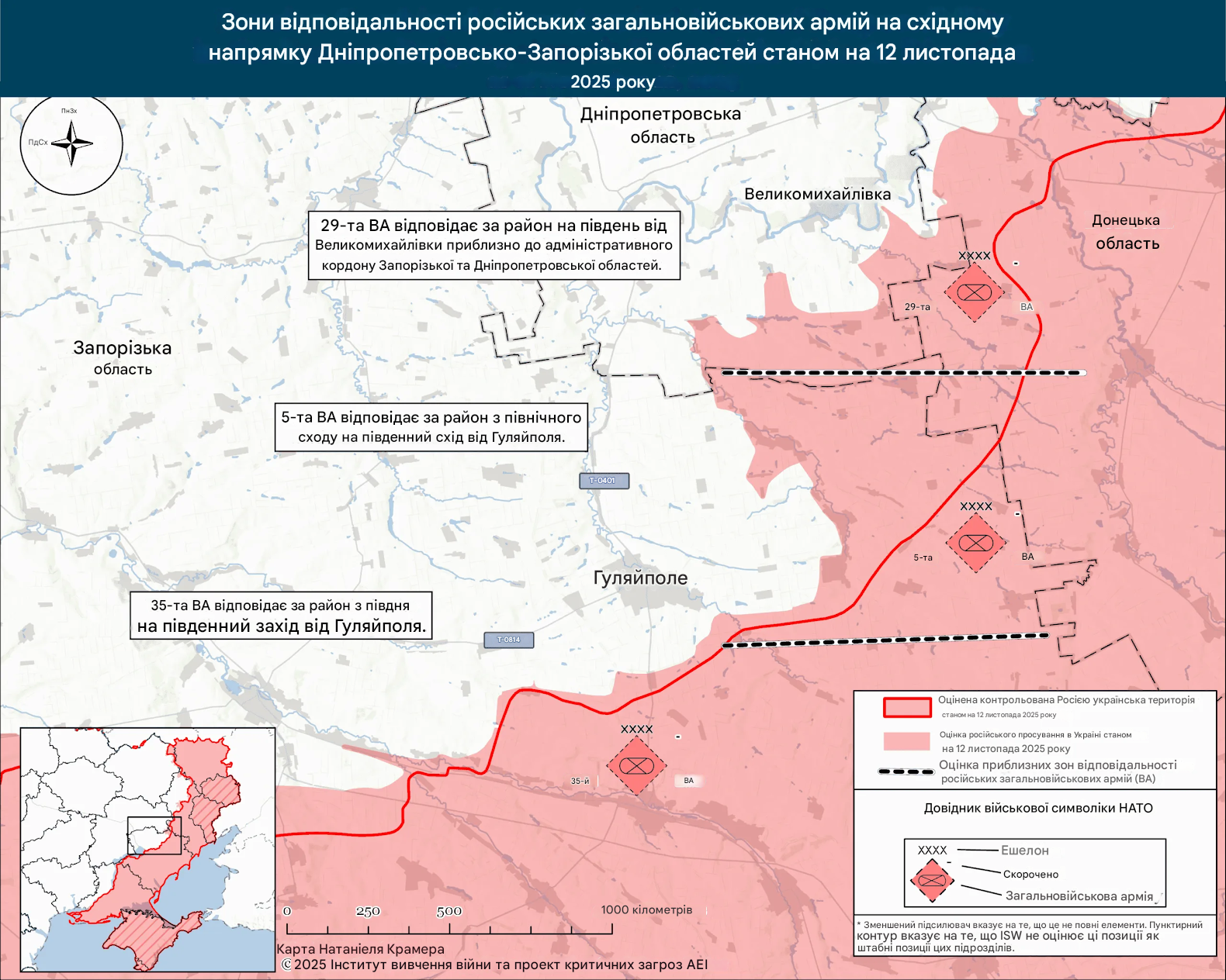 Зони відповідальності російських армій у Запорізькій та Дніпропетровській областях станом на 12 листопада 2025
