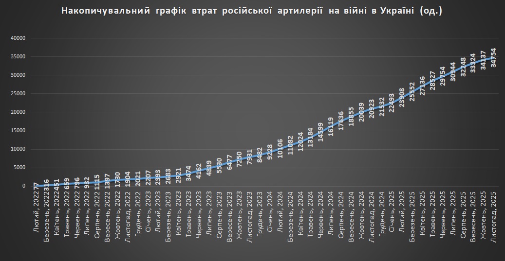 Накопичувальний графік втрат російської артилерії станом на 1 грудня 2025року