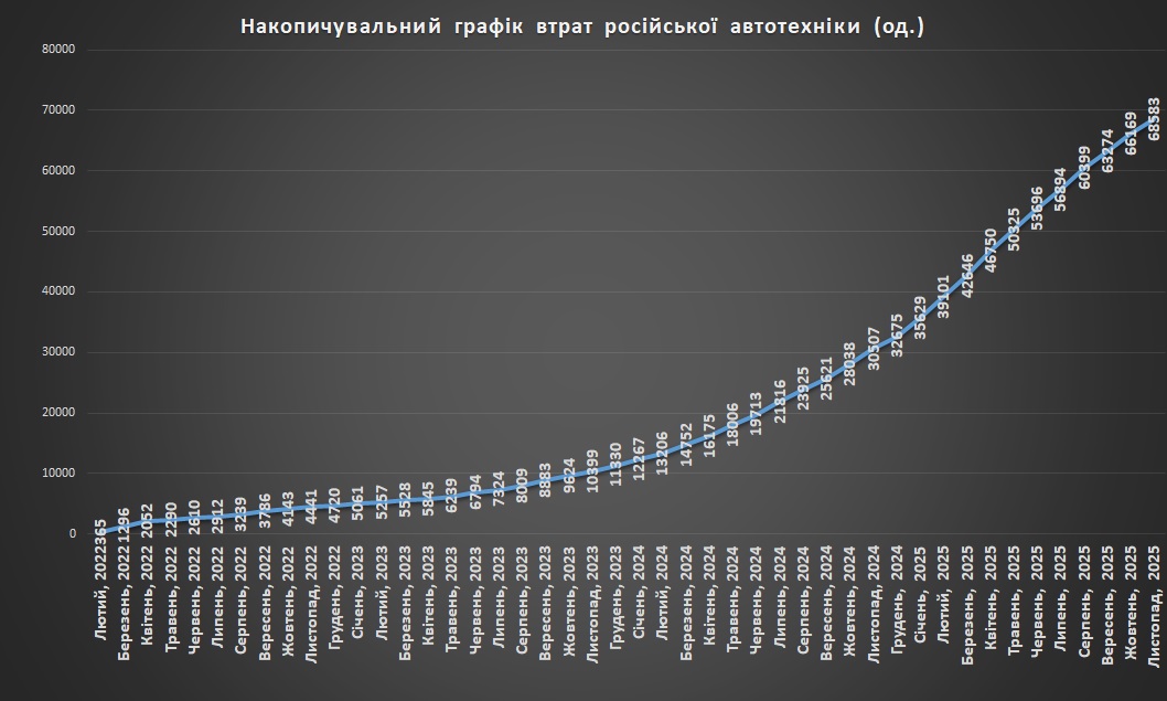 Накопичувальний графік втрат російської автотехніки станом на 1 грудня 2025року