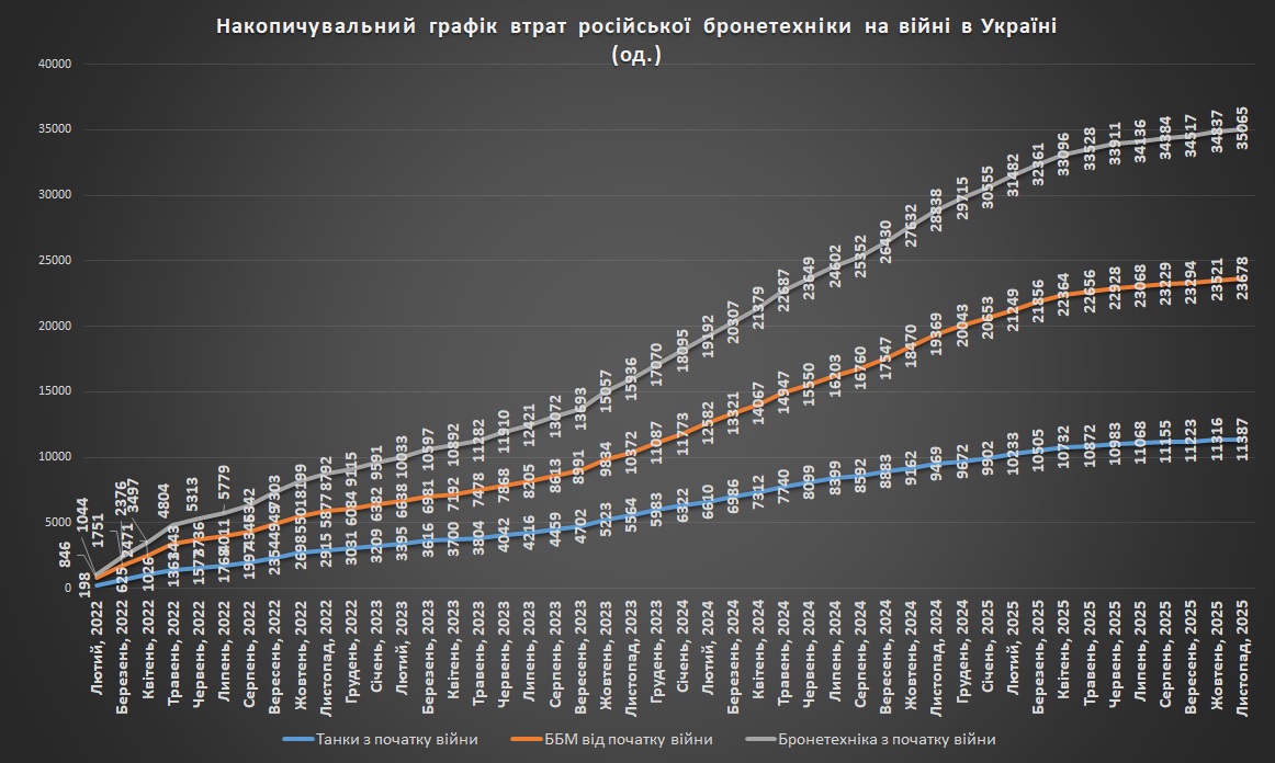 Накопичувальний графік втрат російської бронетехніки станом на 1 грудня 2025