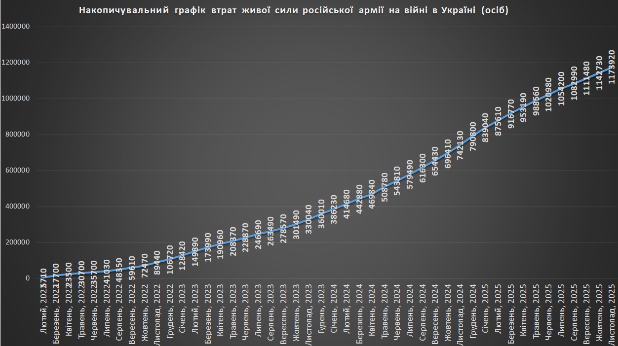 Накопичувальний графік втрат російської живої сили станом на 1 грудня 2025року