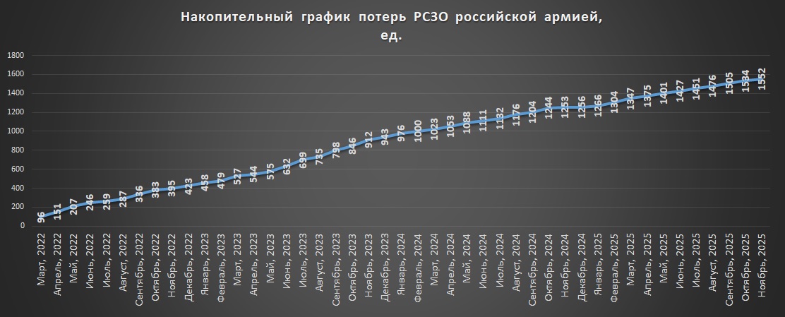 Накопичувальний графік втрат російських РСЗВ станом на 1 грудня 2025