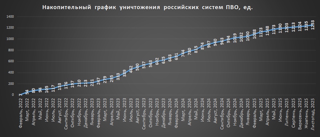 Накопичувальний графік втрат російських систем ППО станом на 1 грудня 2025