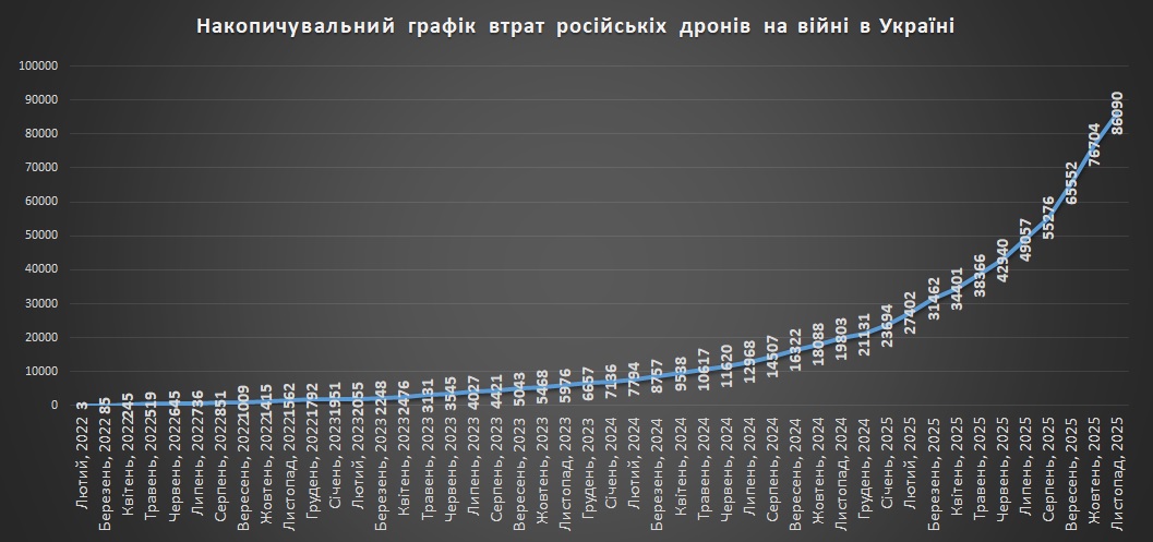 Накопичувальний графік збиття російських БПЛА станом на 1 грудня 2025року