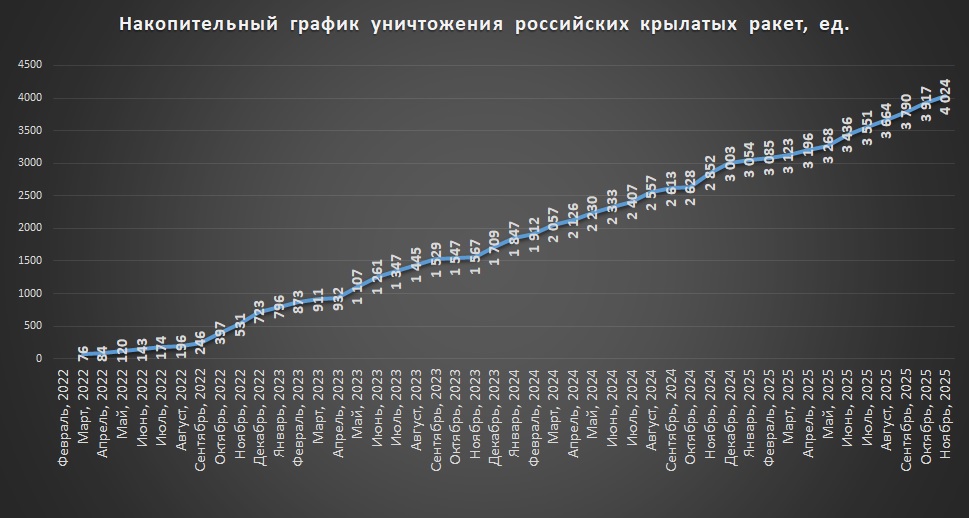 Накопичувальний графік збиття російських крилатих ракет станом на 1 грудня 2025 року