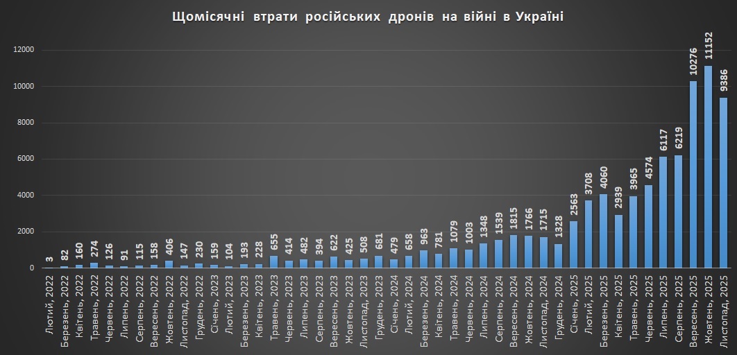 Щомісячне збиття російських БПЛА станом на 1 грудня 2025 року