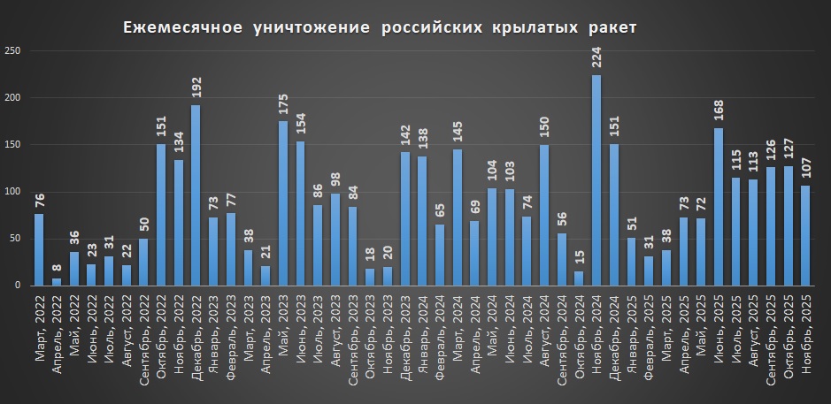 Щомісячне збиття російських крилатих ракет станом на 1 грудня 2025 року