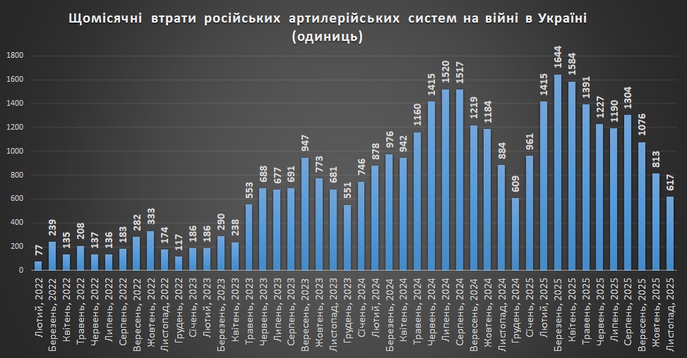 Щомісячні втрати російської артилерії станом на 1 грудня 2025 року