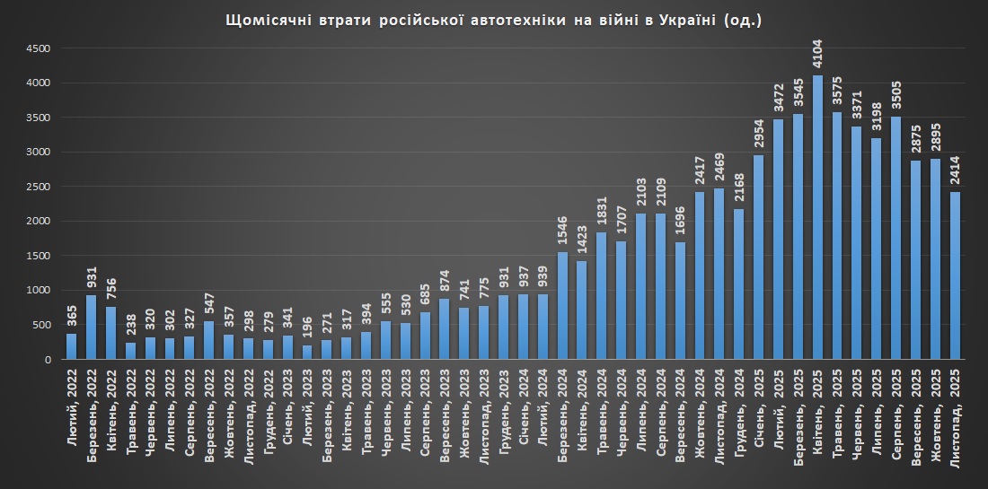 Щомісячні втрати російської автотехніки станом на 1 грудня 2025