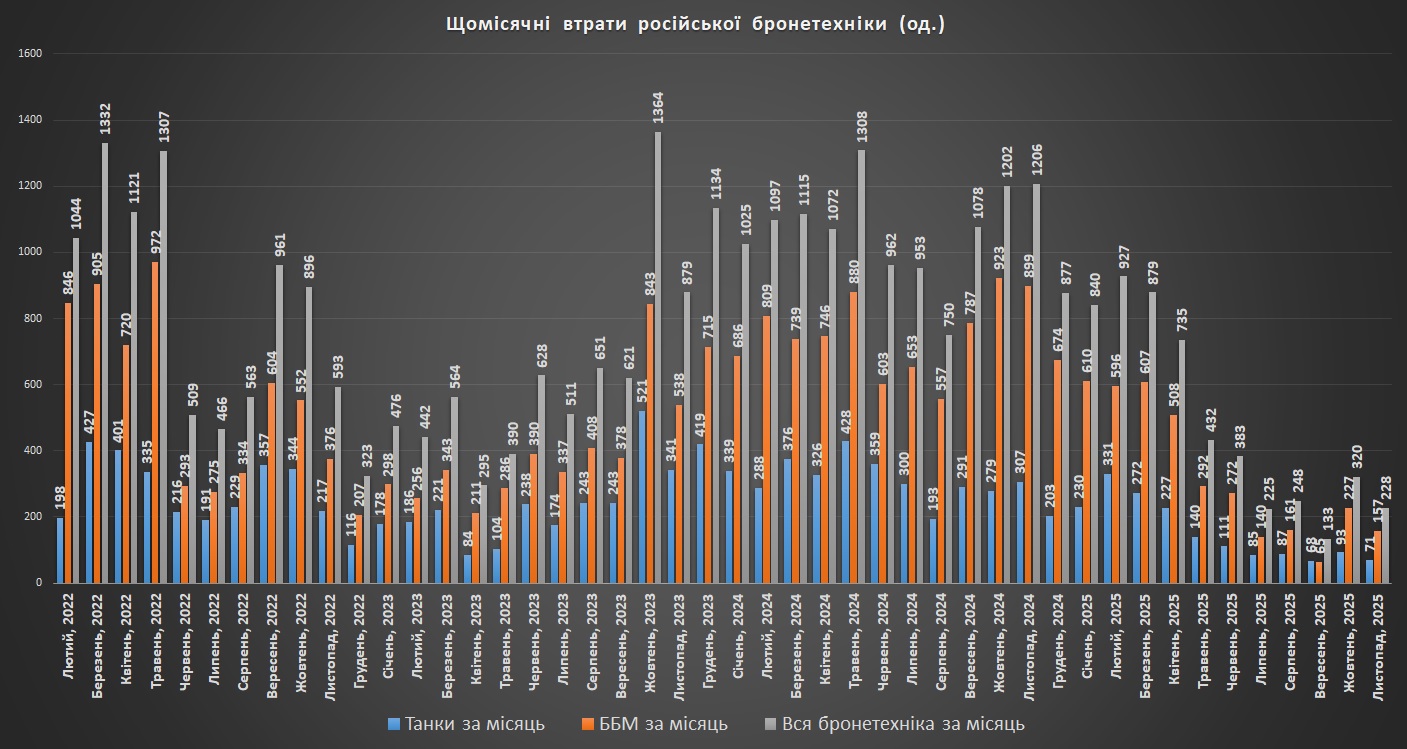 Щомісячні втрати російської бронетехніки станом на 1 грудня 2025