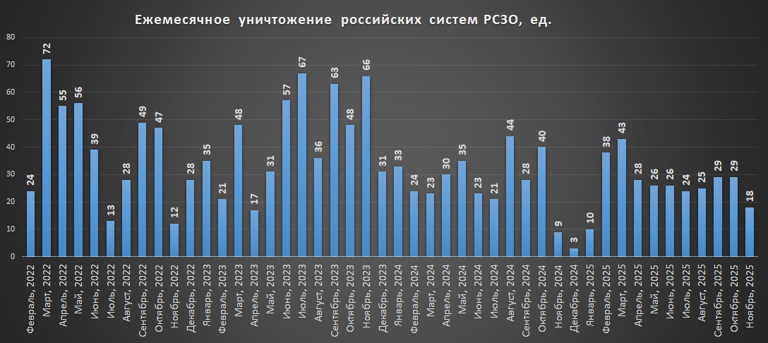 Щомісячні втрати російських РСЗВ станом на 1 грудня 2025