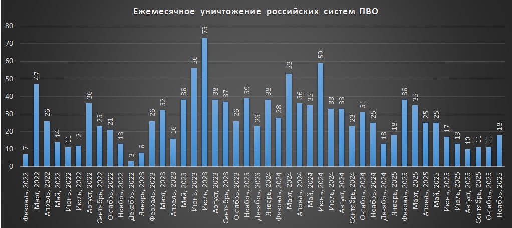 Щомісячні втрати російських систем ППО станом на 1 грудня 2025