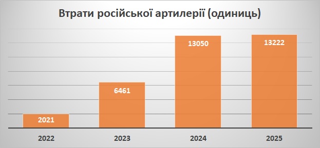 Втрати російської артилерії за роками війни станом на 1 грудня 2025
