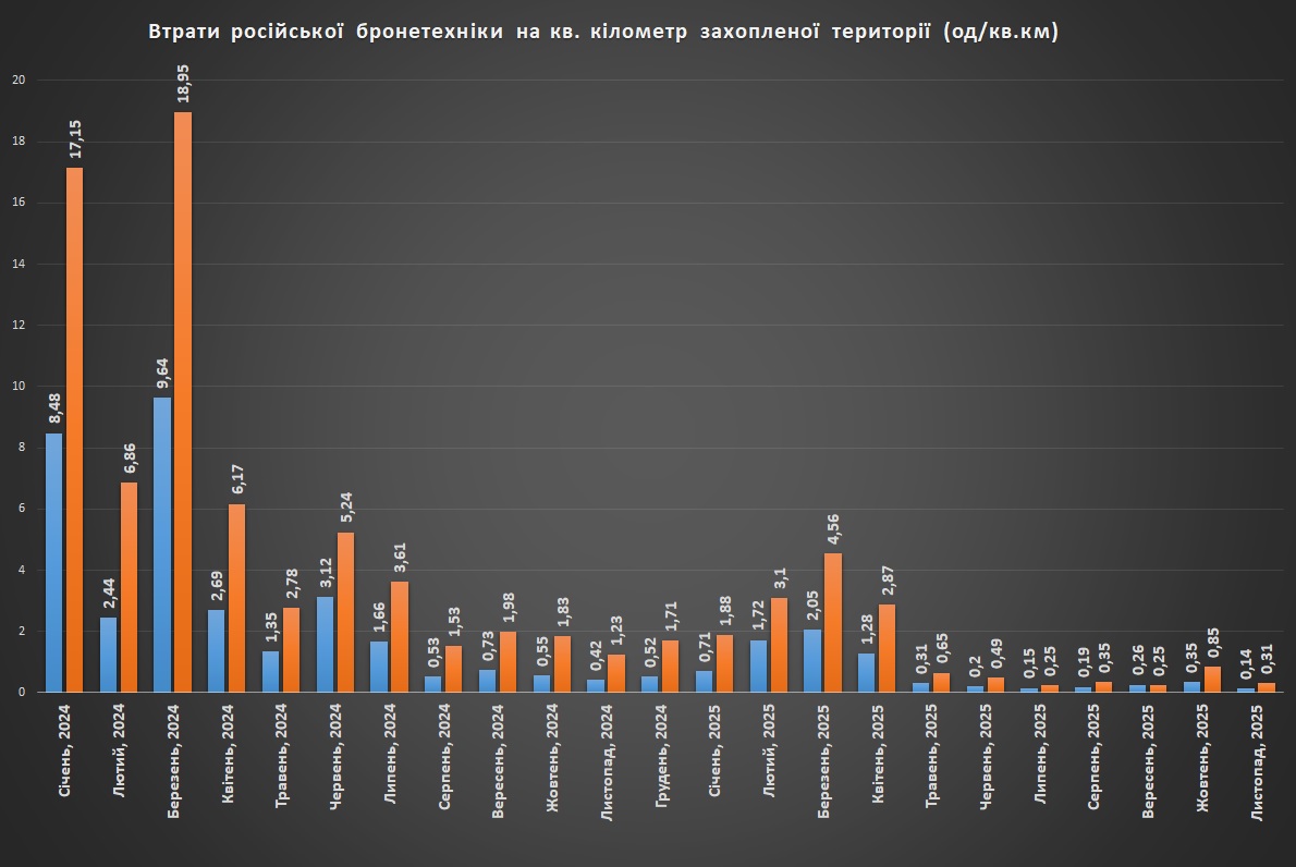 Втрати російської бронетехніки на кв. кілометр захопленої території станом на 1 грудня 2025 року