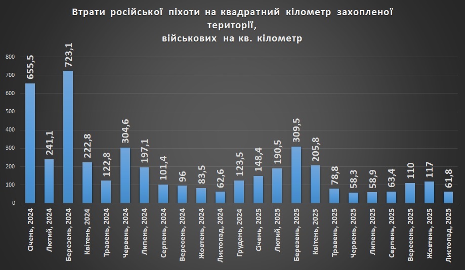 Втрати російської живої сили на квадратний кілометр захопленої території (ефективність захоплення)