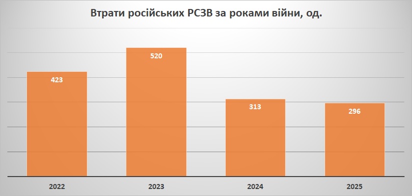 Втрати російських РСЗВ за роками війни станом на 1 грудня 2025