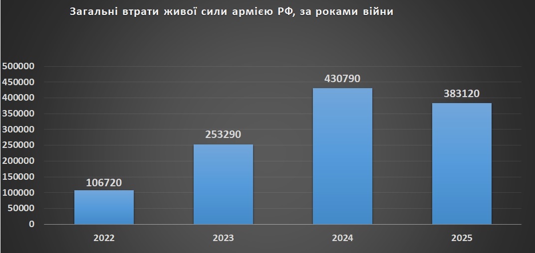 Загальні втрати російської живої сили за роками війни станом на 1 грудня 2025 року