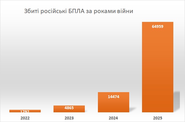 Збиті російські БПЛА за роками війни станом на 1 грудня 2025