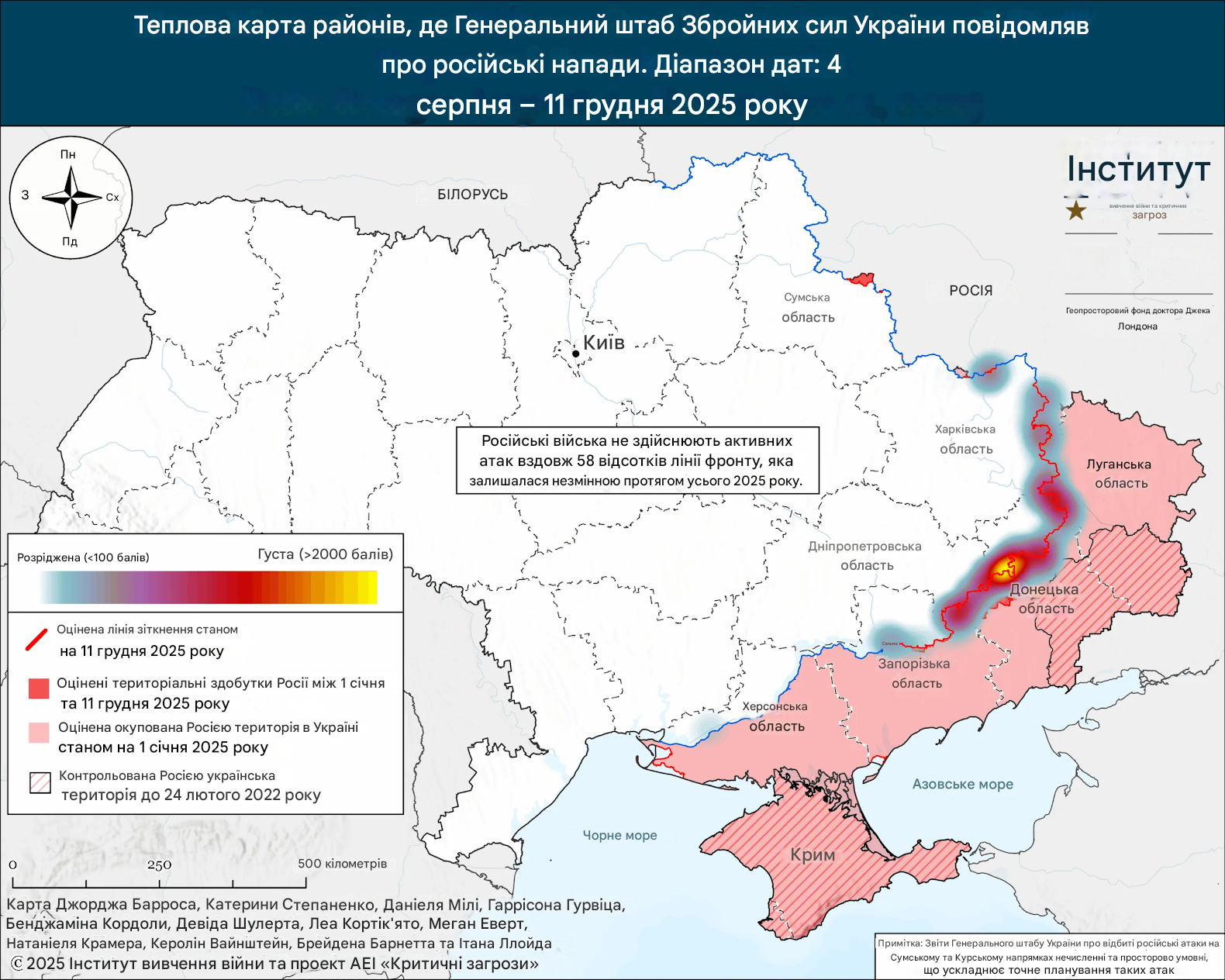 ISW отримав докази, які свідчать про те, що російські війська просунулися на 4 652,2 квадратних кілометра у 2025 році, з яких майже 80 відсотків відбулося лише у шести напрямках: Лиманському, Костянтинівському, Покровському, Новопавлівському, Олександрівському та Гуляйпольському напрямках. У решті 10 напрямків російські війська захопили 964,01 квадратних кілометра у 2025 році, що становить лише приблизно 21 відсоток від загального обсягу російського просування. Ці напрямки включають Сумський, північний Харківський та Великий Бурлуцький, де російські війська не змогли досягти значних успіхів, незважаючи на широко розрекламовані зусилля щодо створення «буферних зон» поблизу кордону між Україною та Росією, а також Херсонський напрямок, де російські війська залишаються на місці з моменту успішного контрнаступу України, який змусив їх відступити із західного (правобережного) берега Херсонської області у листопаді 2022 року.