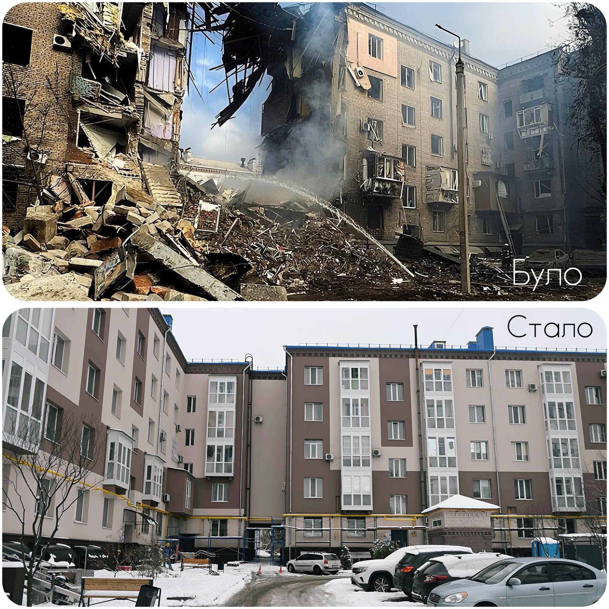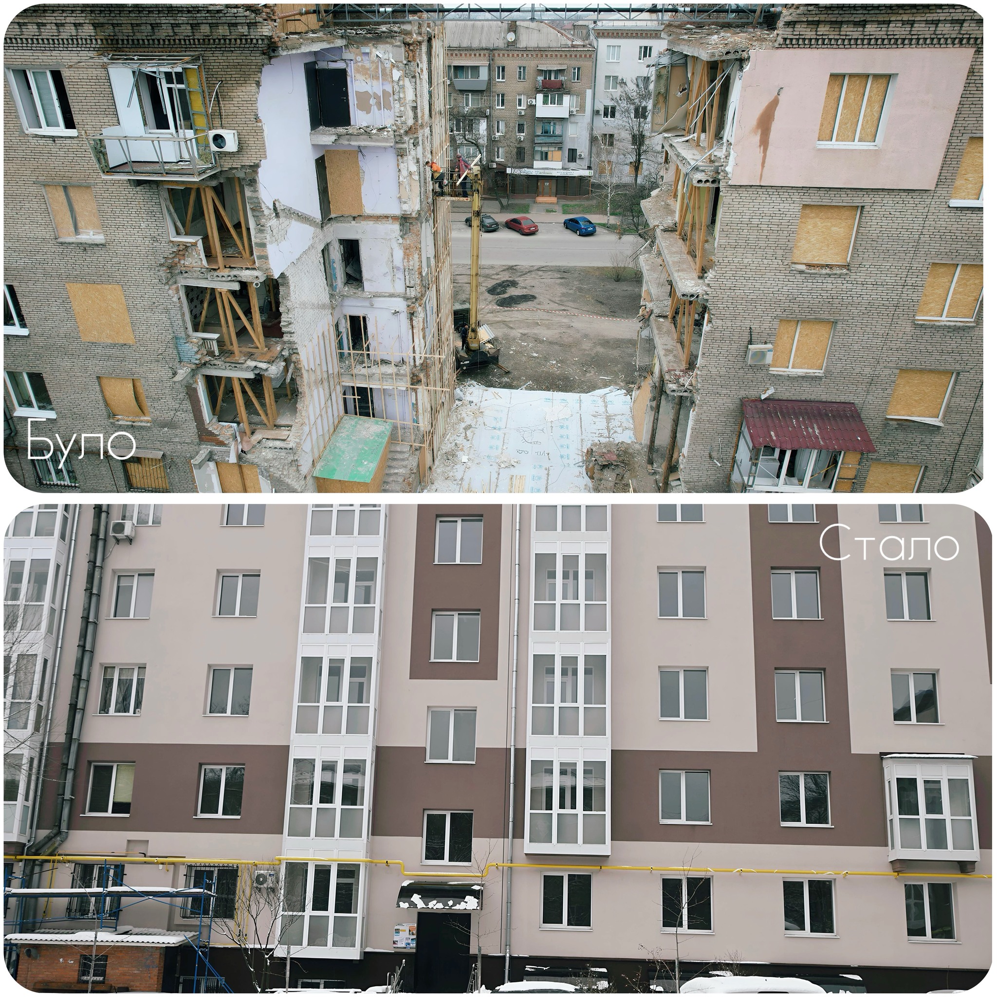 У листопаді 2023 року розпочали відбудову. Будівельники відновили зруйновану секцію 2-го та 3-го під’їздів, влаштували утеплену покрівлю, виконали влаштування магістральних інженерних мереж водопостачання, каналізації та опалення, завершили роботи в квартирах та благоустрій прибудинкової території. Роботи виконувалися з урахуванням інклюзивності та доступності. Всього будівельники відновили з нуля та відремонтували 59 квартир.