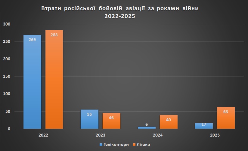 Українська протиповітряна оборона відігнала російські літаки та гелікоптери від зони її дії. Основні втрати росіяни зазнали від диверсійних дій і глибоких дронових ударів Сил оборони. Одна операція “павутина” внесла до “скарбнички” російських втрат 41 літак.