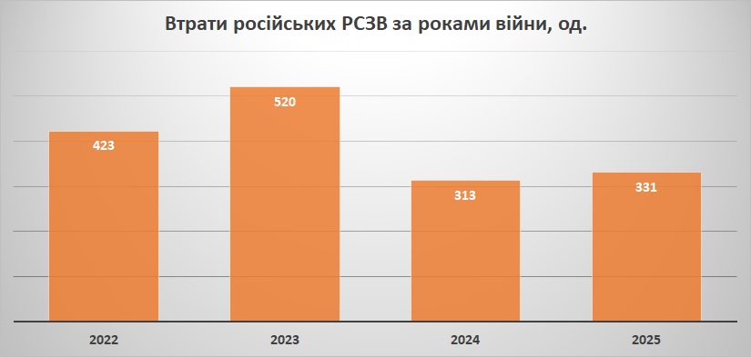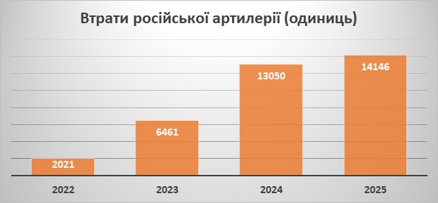 Щорічне стабільне зростання втрат артилерії (ствольна самохідна та буксирована, а також міномети) пов’язане з удосконаленням антибатарейної боротьби (західне обладнання) та безпілотників. Відмовитись від застосування артилерійських засобів, як відмовилася від бронетехніки, Росія не має можливості, адже артилерія – основний засіб підготовки поля бою в тилу противника. Однак, виробництво та закупівлі у союзників не покривають втрат, тому у 2026 році, ближче до осені-зими, очікується виснаження запасів цих озброєнь і пов’язана з цим поступова зміна картини війни.