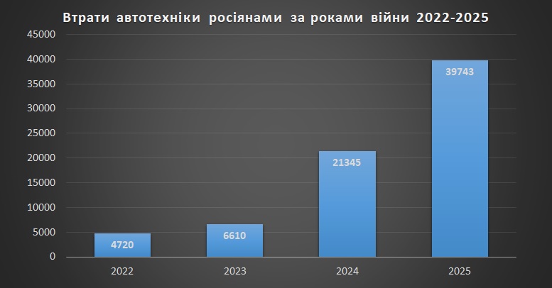 Різке зростання втрат автотехніки у 2025 році, вочевидь, пов’язане із застосуванням Росією легких засобів доставки на полі бою замість вразливої бронетехніки. Звичайно, перероблені цивільні легкові авто, баггі та інші подібні “таксі”, не мають броні, тому вразливіші. Але висока швидкість і маневреність привертає увагу військових і вони цим користуються, оскільки це іноді дозволяє уникнути ударів дронів.