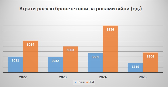 На графіку видно, що кількість втрат бронетехніки різко знизилася 2025 року. Це пов’язано з різким зменшенням її застосування, тому що статистика 2024 року показала, що різке зростання застосування ударних безпілотників унеможливило подальшу масову участь танків і бронемашин у боях.