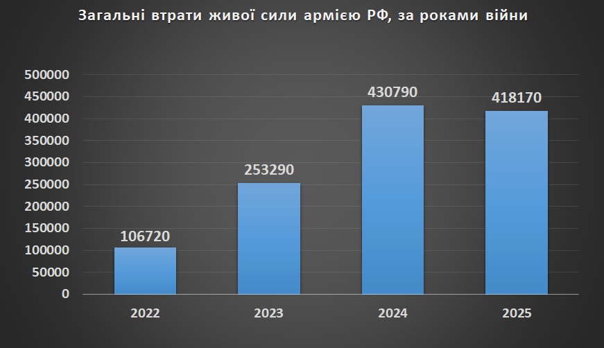 2024-2025 роки стали рекордними за кровопролиттям для РФ, з щоденними втратами в середньому понад 1000 військових. У 2025 році збільшився середній вік загиблих росіян – близько 50 років. 2024 року цей показник був близько 45 років, а 2023-го – ще нижчий. Це свідчить про те, що якість живої сили російської армії щорічно знижується. Це призвело до дефіциту кадрів, змушуючи Кремль переходити до примусового набору резервістів та постійного призову (261 000 у 2026 році).