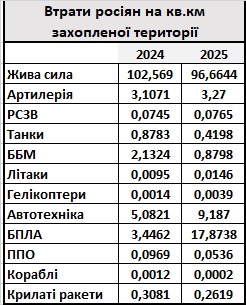 Таблиця вказує на зміну ефективності російської армії (витрат людей та обладнання на квадратний кілометр захоплених територій) порівняно з попереднім, 2024 роком. Так, на 1 кв. кілометр у 2025 році витрачалося на 6 військових менше, що вказує на зростання ефективності. Те саме можна сказати і про бронетехніку: ефективність танків зросла вдвічі, а ББМ майже в 2,5 рази. Цю техніку на полі бою замінили автотехніка та безпілотники – саме за рахунок збільшення спалення цієї техніки зменшилися витрати бронетехніки особового складу на одиницю захоплених площ.