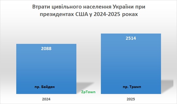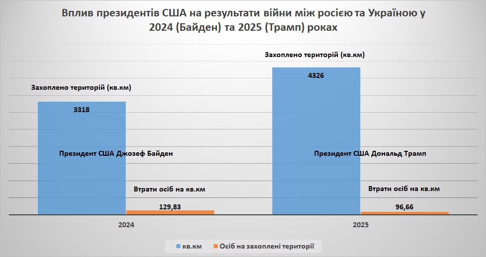 Нижче наведено графіки, які порівнюють результати війни у 2024 та 2025 роках за президентів США Джо Байдена та Дональда Трампа відповідно.