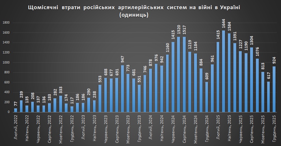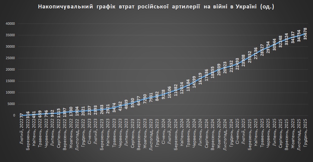 Накопичувальний графік втрат російської артилерії станом на грудень 2025Щомісячні втрати російської артилерії станом на грудень 2025