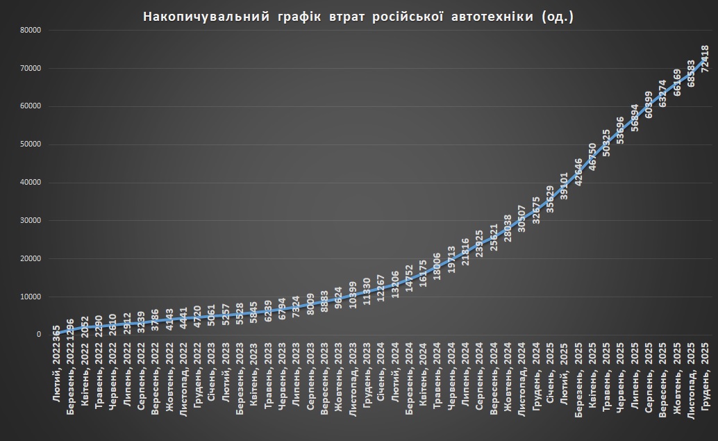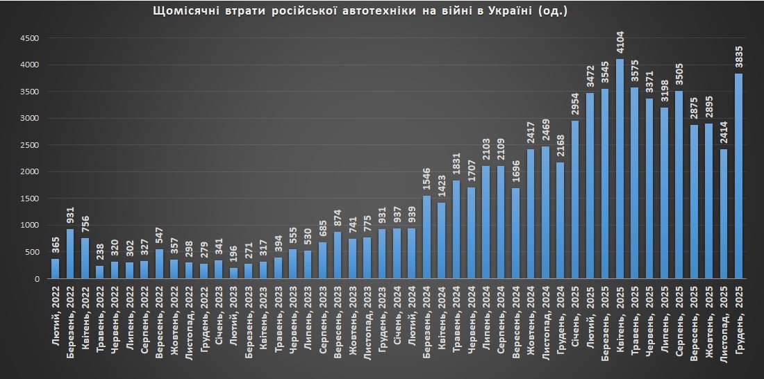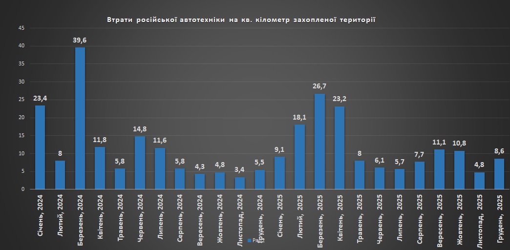 Накопичувальний графік втрат російської автотехніки станом на грудень 2025Щомісячні втрати російської автотехніки станом на грудень 2025 рокуВтрати російської автотехніки на кв. кілометр захопленої території станом на грудень 2025