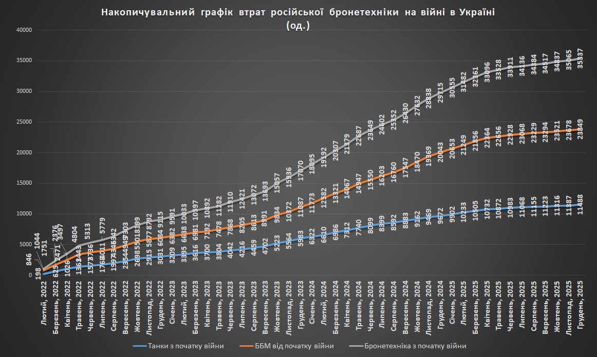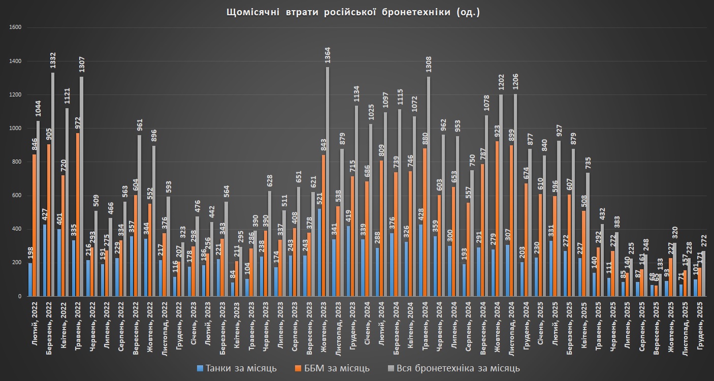 Накопичувальний графік втрат російської бронетехніки станом на грудень 2025Щомісячні втрати російської бронетехніки станом на грудень 2025Втрати російської бронетехніки на кілометр захопленої території станом на грудень 2025р.