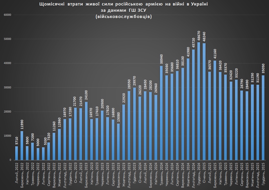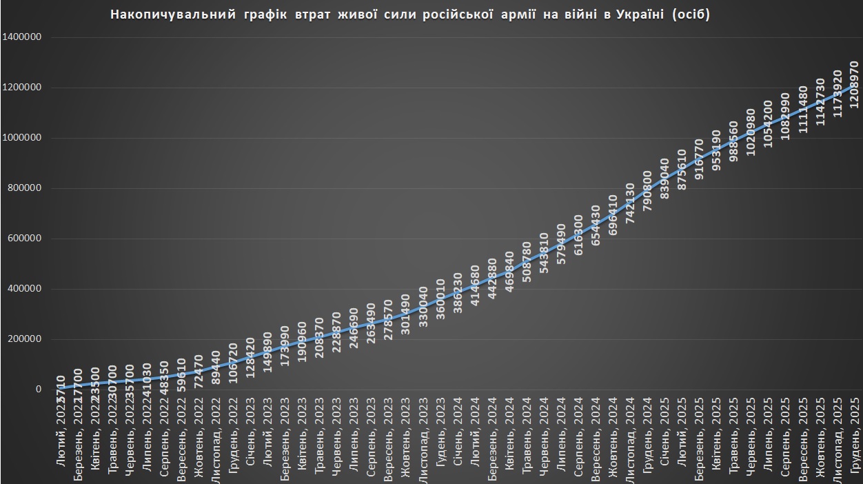 Накопичувальний графік втрат російської живої сили станом на грудень 2025Щомісячні втрати російської живої сили станом на грудень 2025Захоплення росією українських територій станом на грудень 2025Втрати російської живої сили на квадратний кілометр захопленої території станом на грудень 2025