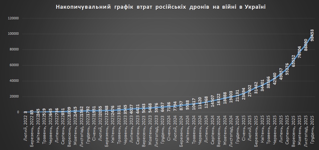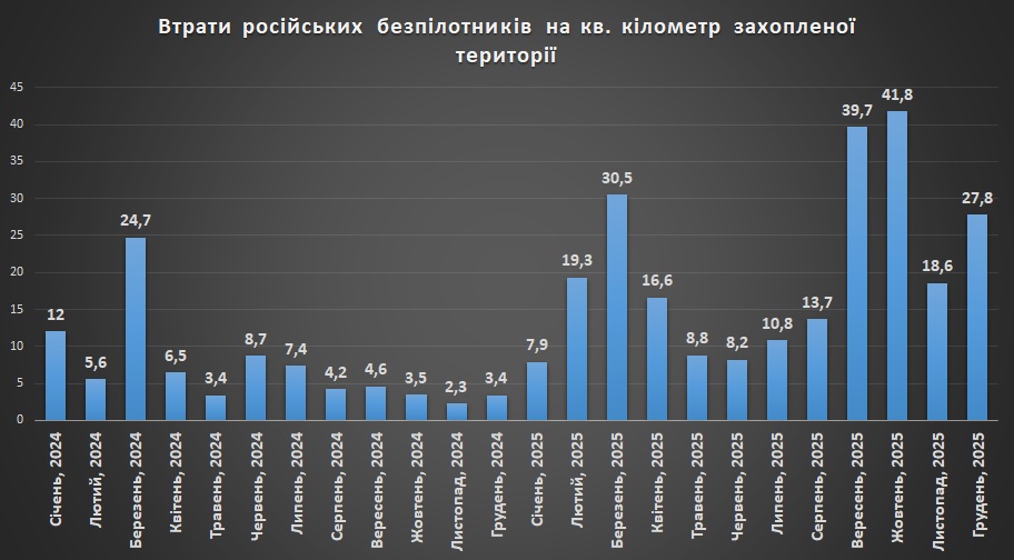 Накопичувальний графік втрат російських дронів станом на грудень 2025Щомісячний графік втрат російських дронів станом на грудень 2025Втрати російських БПЛА на кв. кілометр захопленої території станом на грудень 2025