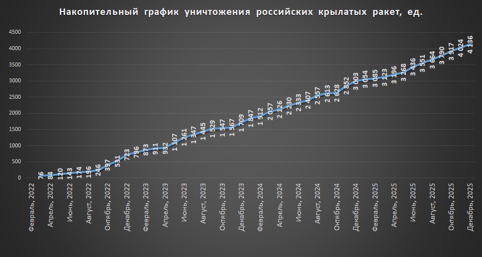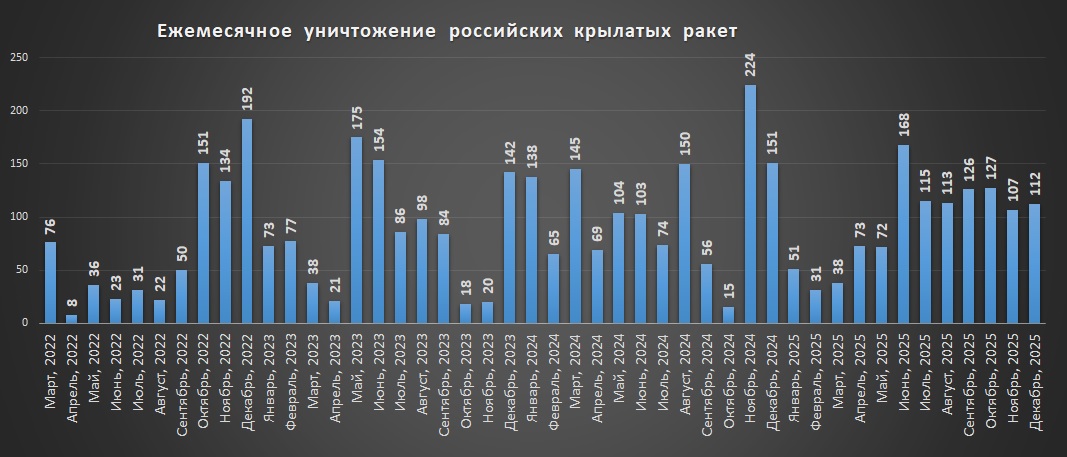 Накопичувальний графік втрат російських крилатих ракет станом на грудень 2025Щомісячний графік втрат російських крилатих ракет станом на грудень 2025