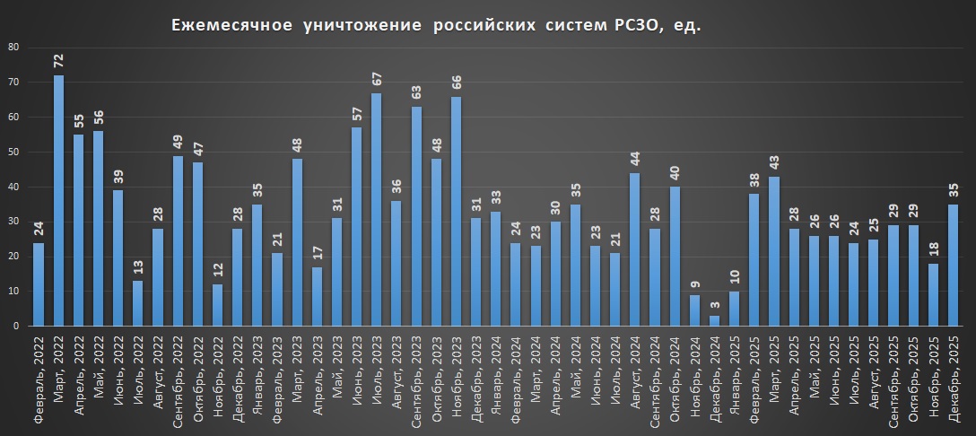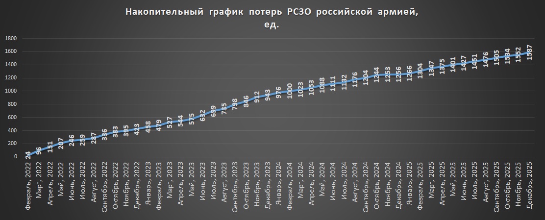 Накопичувальний графік втрат російських РСЗВ станом на грудень 2025Щомісячні втрати російських РСЗВ станом на грудень 2025