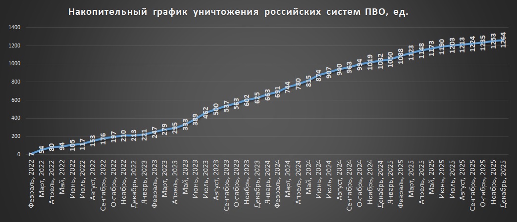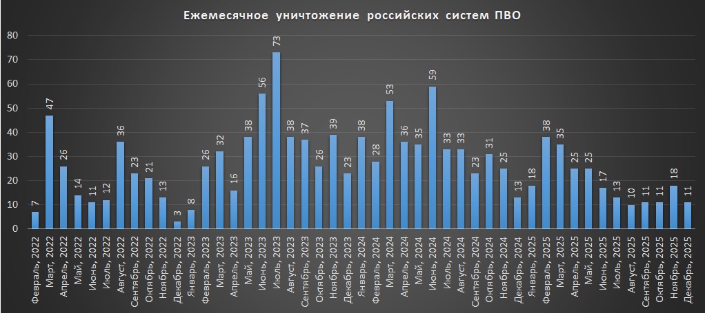 Накопичувальний графік втрат російських систем ППО станом на грудень 2025 р.Щомісячні втрати російських систем ППО станом на грудень 2025