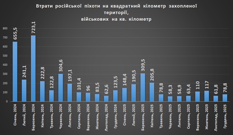 Російська армія, просуваючись, зазнає великих втрат. У грудні захоплена територія становила 445 квадратних кілометрів. При цьому втрати особового складу кв. кілометр захопленої території зменшилися з 61,8 у листопаді до 78,8 у грудні бійців на кв. кілометр. Це свідчить про підвищення ефективності наступу. Цей показник залежить від місцевості, погоди, оснащеності протидіючих сил.
