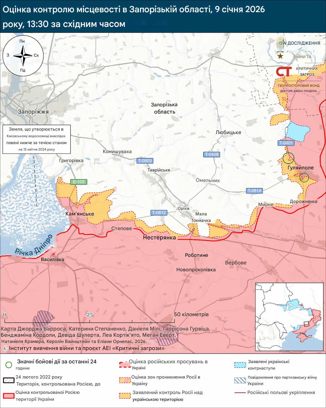 Інші геолокаційні відеозаписи, опубліковані 9 січня, показують російського військовослужбовця, який піднімає прапор у Зеленому (на північ від Гуляйполя), що, за оцінкою ISW, було російською місією проникнення, яка не змінила контроль над місцевістю чи переднім краєм зони бойових дій. Додаткові геолокаційні відеозаписи, опубліковані 9 січня, показують, як українські сили атакують російські позиції на західній околиці Прилук, що свідчить про те, що російські сили проникли в населений пункт раніше.