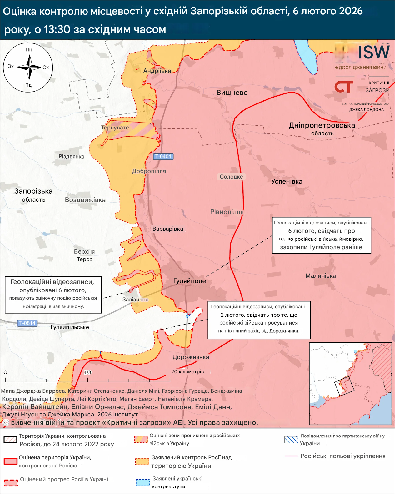 Геолокаційні кадри, опубліковані 6 лютого, показують, що українські війська завдають ударів по російських позиціях на півночі Залізничного (на захід від Гуляйполя), що свідчить про те, що російські війська просунулися за межі Гуляйполя раніше. ISW не спостерігав протягом останніх кількох тижнів доказів того, що українські війська продовжують утримувати оборонні позиції в Гуляйполі, а характер нещодавніх російських проникнень та просувань у цьому районі свідчить про те, що російські війська утримують місто.