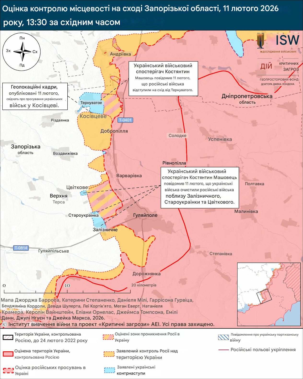 Про це повідомив український військовий спостерігач Костянтин Машовець. Геолокаційні відеозаписи, опубліковані 11 лютого, свідчать про те, що українські війська також просунулися в Косівцеві (на північний захід від Гуляйполя), свідчить американський Інститут вивчення війни.